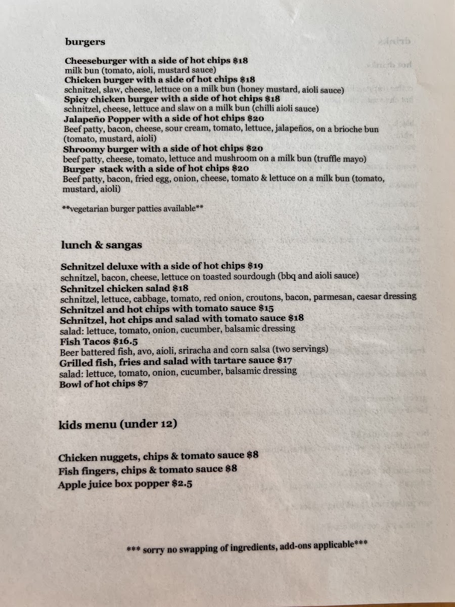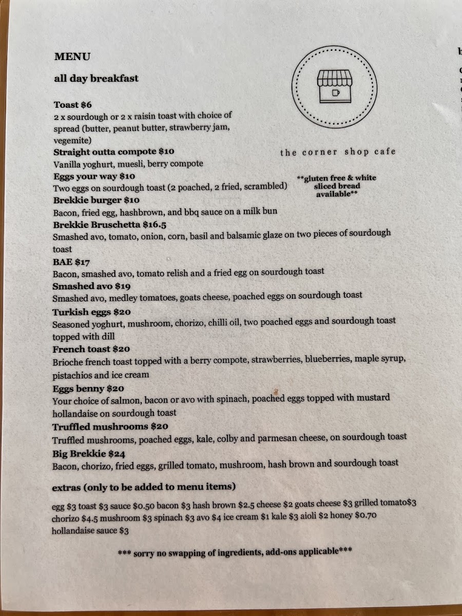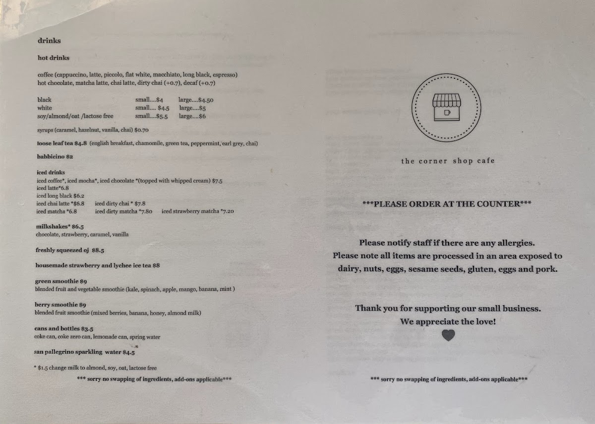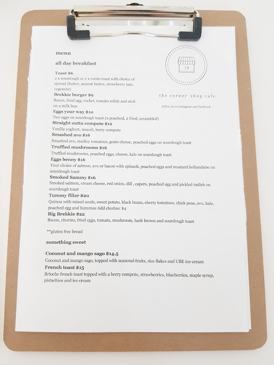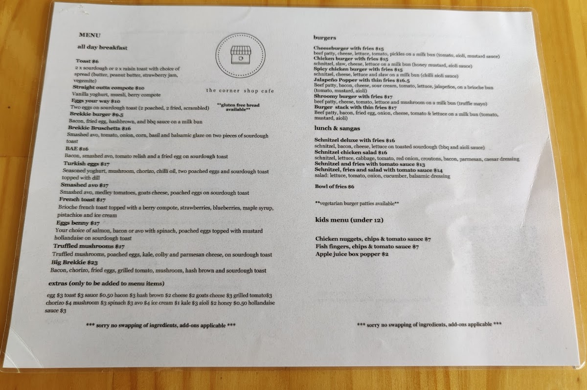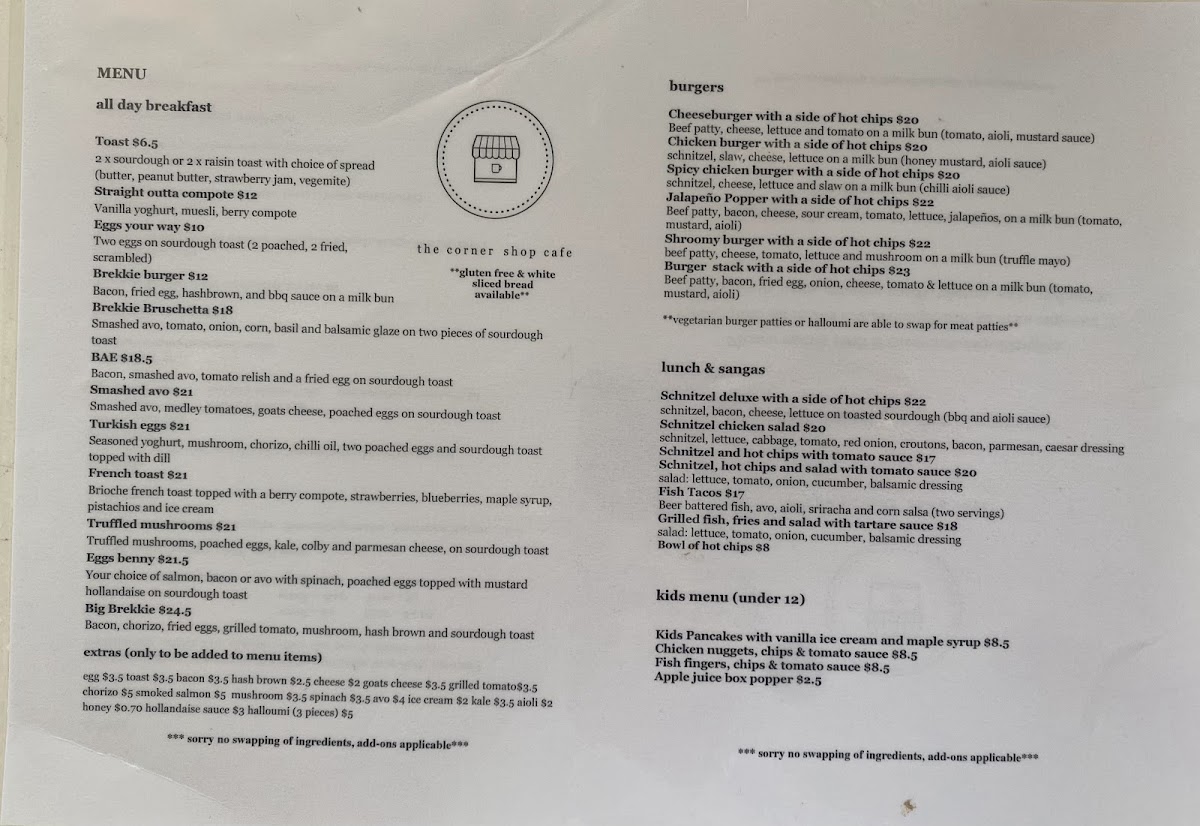 From a reviewer’s perspective, the menu at The Corner Shop Cafe, located at 1/216 Farnham Rd, Quakers Hill NSW 2763, Australia, presents a well-rounded and approachable selection that caters to all ages and appetites throughout the day. The All Day Breakfast offerings such as Toast, Brekkie Burger, Eggs Your Way, Ricotta Toast, and the hearty Pulled Pork Burger set the tone for a comforting, café-style experience that works just as well in the morning as it does later in the day. Moving into lunch, classics like the Classic Hamburger With Chips, Cheeseburger With Chips, Chicken Burger With Chips, Spicy Chicken Burger With Chips, and Steak Sanga With Chips highlight the café’s focus on satisfying, familiar flavors done right. For those looking to share or complement their meals, sides such as the Bowl Of Fries and Garden Salad are simple yet essential additions. Families are clearly well considered with a dedicated Kids Menu featuring crowd-pleasers like Cheese Melt, Chicken Nuggets, Chips And & Sauce, and Fish Fingers, Chips And & Sauce. Burger lovers will appreciate the variety in the Burgers section, ranging from the Cheeseburger With Fries and Chicken Burger With Fries to more adventurous choices like the Spicy Chicken Burger With Fries, Jalapeño Popper With Thin Fries, and Shroomy Burger With Fries. The Lunch & Sangas selection, including Schnitzel Deluxe With Fries, Schnitzel Chicken Salad, and various schnitzel-and-fries combinations with tomato sauce, reinforces the café’s strength in generous, filling meals. To finish on a sweet note, desserts like Coconut And Mango Sago, the indulgent Nutella Burger, and classic French Toast provide a satisfying conclusion. Overall, the menu reflects a thoughtful balance of comfort food, variety, and approachability, making The Corner Shop Cafe a reliable and enjoyable dining spot for both locals and visitors.